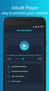 Best Mp3 Editor is the most amazing and richest mp3 editor ever created on Play Store.Best Mp3 Editor is a multifunctional Android application for music lovers and musicians.Best Mp3 Editor allows you to cut audio files, mix two audio files and merge unlimited audio files. , Convert audio files from one format to another, change the speed of audio files and many mores.