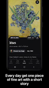An app for all art and museum lovers. Get inspired by one piece of art a day! Every day, be inspired by masterpieces of classical, modern and contemporary art and read news about them. Every day, be inspired by masterpieces of classical, modern and contemporary art and read news about them. Join the community of over 1,000,000 art lovers, for whom DailyArt is something that brightens their day, every day. Free! Now available in English, Simplified Chinese, Traditional Chinese, Arabic, Dutch, German, Hindi, Farsi, French, Italian, Japanese, Korean, Polish, Portuguese, Spanish, Russian and Turkish. New translations will be coming soon!