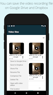 * Save recorded video files directly to Google Drive and Dropbox.