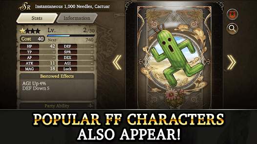Just like in previous FINAL FANTASY games, Limit Bursts are a character’s best chance to turn the tide of combat with stunning visuals and powerful attacks. Limit Bursts can be activated by accumulating enough energy over numerous turns and other actions, which will deal specific types of damage to enemies based on the characters’ status. Espers, characters from the FINAL FANTASY series, will make appearances in the form of CG animations, granting the player great power to support their cause and progress in the story.