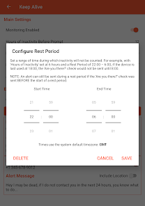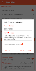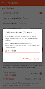 Keep Alive will send a personalized SMS message to one or more people if you have not used your device for a specific period of time. Intended to be used as a failsafe for those who live alone in the event of an accident or other emergency. Once the settings are configured, no further interaction is required. Android now automatically removes permissions for apps that haven’t been used recently. Keep Alive, once settings are configured, requires no further interaction and can have its permissions revoked, possibly preventing it from sending an alert. Keep Alive was designed to work as unobtrusively as possible, and instead of asking the user to open the app periodically, it expects this behavior to be disabled. On the most recent version of Android, this is called “Suspend app activity if not in use” and can be found on the App Info screen for Keep Alive.