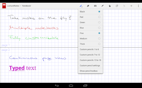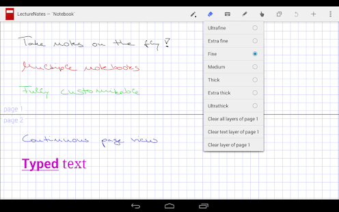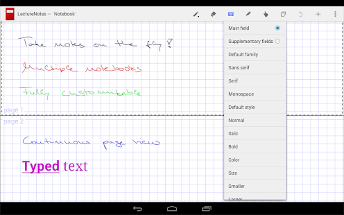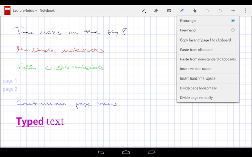LectureNotes is an Android application allowing you to take notes by hand on the screen, especially with a stylus. It was designed with a user in university (or school) in mind, for example a professor who uses it to prepare for a lecture or even for real teaching or a student who uses it to take notes handwritten during a conference.