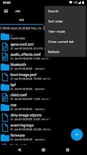 Characteristics include multiple tabs, Google Drive, Box, Dropbox and network (SMB) support, SQLite database viewer, Text Editor, create and extract zip or tar/gzip files, extract rar archives, multi-select, execute scripts, search, remount, permissions, bookmarks, send files (via email, bluetooth etc), image thumbnails, APK binary XML viewer, change file owner/group, create symbolic link, “Open With” facility, MD5, create shortcuts.