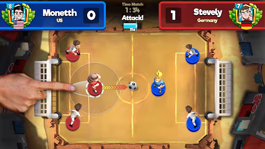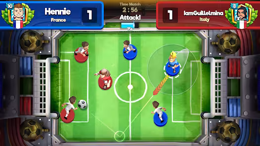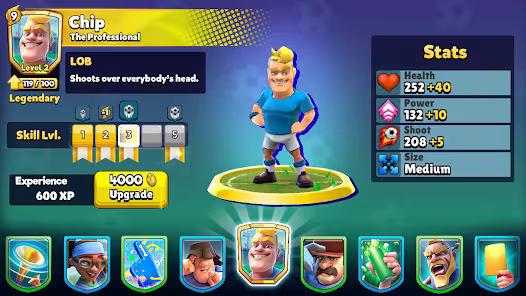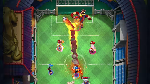 Soccer Royale is a soccer game with unique gameplay that combines tactical and action elements to make matches more engaging. Your players have many powerful and elegant skills to kick the ball into the opponent’s goal, so organize them and use them wisely to defeat all your opponents. Soccer Royale gameplay is unique and interesting as it combines action and tactical genres with football. Players with opponents will control their teams; you will start with the game’s default players and have no special abilities. When it’s your turn, you can choose a player on the field and turn them into a special player using your player card. Additionally, you will select the player who will attack the ball and shoot it into the goal by adjusting the direction and strength of the shot. Then, a member of your team will launch a powerful shot at the ball, sending it in the desired direction. When the ball collides with opposing players, they lose life points.