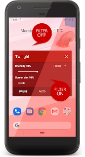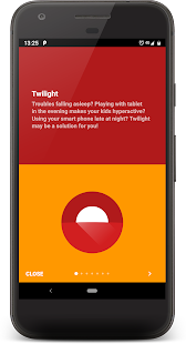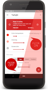 The Twilight app allows your device’s screen to adjust to the time of day. It filters the stream of blue light emitted by your phone or tablet after sunset and protects your eyes with a soft and pleasant red filter. The intensity of the filter is smoothly adjusted to the solar cycle according to the local time of sunset and sunrise. Recent research suggests that exposure to blue light before sleep can alter your natural (circadian) rhythm and lead to an inability to fall asleep.