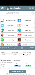 Vetcalculators is a collection of drug dosage calculators for veterinarians and technicians from the number one veterinary calculator website, Vetcalculators.com. It includes calculators for emergency and anesthetic drugs, antibiotics, constant rate infusions (CRI) (single drug, multiple drugs and loading doses), IV fluid levels, chocolate toxicity, drug requirements. calories, blood transfusions, a blood sugar curve generator and unit conversion calculators. , including weight, temperature, body surface area, mg in ug, cc in ounces, cm in inches.