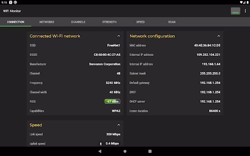 WiFi Monitor Pro is a powerful tool that allows you to analyze the state of WiFi networks and follow its parameters (signal strength, frequency, connection speed, etc.). It is useful for setting up a wireless router, monitoring Wi-Fi usage. It can also be used as a scanner and discovering devices connected to the WLAN.